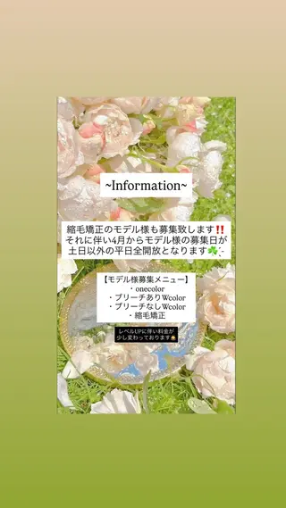 4月2日キャンセル出た為🈳ございます🍀ワンカラー、ブリーチカラー、Wカラー、縮毛矯正のモデル様を募集しております🎀喜んで頂けるよう笑顔で精一杯頑張ります✨レディースメンズどちらも大歓迎です!