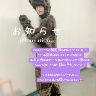 技術向上為、正規料金よりお安く価格を設定し募集させていただいております!◆カット(長さ規定あり)◆ワンカラー◆髪質改善トリートメント◆トリートメント◆ヘッドスパ◆フェイシャル右上の♡でお気に入り登録していただくとメッセージのやりとりがスムーズになります!ご登録お願い致します^^当日予約も承っております!当日予約に関しまして営業中のためすぐに返事が返せない場合がごさいますので電話して頂けるとスムーズにご案内可能です。お得なminimo限定価格にて、お悩みや雰囲気に合わせてお客様にピッタリなスタイルをご提案させていた...