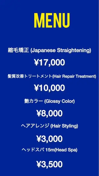 Instagram@mimi_aus27縮毛矯正➡️髪の広がり・強いくせが気になる方髪質改善➡️ダメージケア・髪の内部補修・うねりの軽減カラー➡️カラーによるダメージを軽減するため、一人一人の髪質を見極め栄養のお薬を混ぜて選定どんな髪質もツヤツヤに仕上げられるよう最善を尽くし責任感を持って施術いたします。★海外ヘアといえば軽くドライな質感が主流ですが、私が推していきたい海外スタイルでは"海外ヘア×ツヤ"といった掛け算をし透明感や光沢のある髪に仕上げます!★price通常料金よりもお得なモデル価格でご案内!!!縮毛矯正¥...