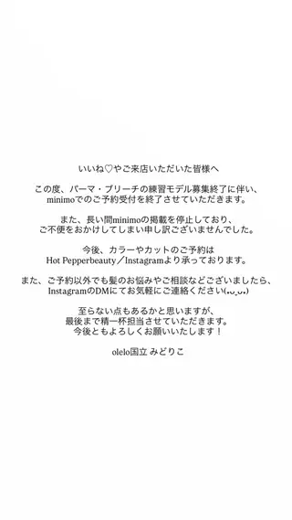 ✨当日予約歓迎✨期間限定で、ご新規様の価格を少し下げました!この機会に是非一度ご来店ください☺️丁寧な技術とカウンセリングに好評をいただいております!たくさんの中からご覧いただきありがとうございます✨Jrスタイリストとしてカットはデビューしましたが、技術向上のため全メニュー、モデルを募集しております🪽施術内容によってはスタイリストのチェックの元施術させていただきます!平日の10時〜15時のみとなりますが、当日予約も大歓迎でお待ちしております✨丁寧なカウンセリングと施術を心掛けております。是非ご協力よろしくお願いいたします✨お気に入り🤍に追加していただくとメッセージでのやり取りが可能になります💌