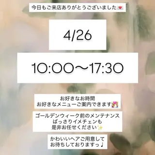 当日予約ok ⟡.· スタイリングはプチアレンジも出来ます!髪を綺麗にするお手伝いをさせてください♩Instagram / @zizoudesuご覧いただきありがとうございます⟡名古屋伏見にある「LESS」と「PUF」でアシスタントをしてます、古川真央です!「LESS」と「PUF」を行き来しているので店舗が月によって変わります、ご了承ください🙇🏻♀️スタイリストデビューを控え技術向上のためモデルさんを募集させていただいております!Instagramのdmからご予約、ご相談可能です!@zizoudesuお気軽にご連絡ください🍃日時平日13:30~20:00土・日・祝18:00~の時間帯で募集させていただいております!火曜日は定休日になります!モデル様は随時募...