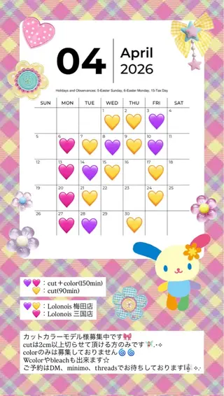はじめまして💫梅田のLIVOSAKAでスタイリストをしている吉原佳穂です🌹数ある中の掲載からご覧頂きありがとうございます💓エクステモデルさんを募集しています💫40本¥6000〜(一本追加ごとに¥150)高級シールエクステを使用しているので手触りやカールの持ちなども上質です👌是非ご予約お待ちしております☺️技術向上のた為のカラーモデルさんも大募集しています🌈写真撮影が可能な方のみの募集となります🙇🏼♀️仕上がりは経験豊富なスタイリストがきちんとチェックして下さるので安心してください🌱是非ご予約お待ちしております💫※月曜日は...