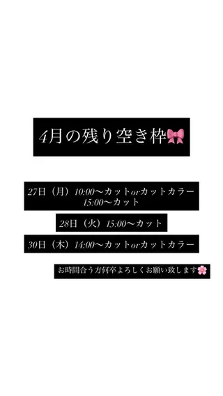 💈4/26(日)🈳すぐ予約ok💈【シールエクステ🉑】半個室プライベートサロン♪透明感カラー・暖色カラー・髪質改善トリートメント得意です♪ケラスターゼ・オージュア・LOA取り扱い店です♪数多くあるページの中からご覧頂きありがとうございます❣️♡マークを押して頂くとやりとりがスムーズに行えますので登録よろしくお願い致します!指名料➕¥500頂戴いたします🙇🏼▫️▫️▫️▫️▫️▫️▫️▫️▫️▫️▫️▫️▫️那覇市美容室【miloc】stylistMOMOYOです🧏🏼▫️▫️▫️▫️▫️▫️▫️▫️▫️▫️▫️▫️▫️しっかりとお客様に寄り添い今のお客様にあった提案をさせて頂きます🫧【注意事項】💈💈💈💈💈💈💈💈💈💈💈💈予約状況によってはご予約をお断りさせて頂く場合やメニュー内容のご変更をして頂く場合がございます事をご了承下さい💭💈💈💈💈💈💈💈💈💈💈💈💈💈...