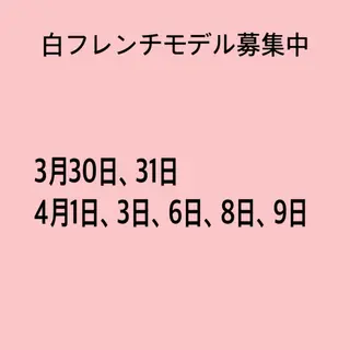 [募集内容]募集内容、注意事項すべてご確認下さい🙇♀️!通常予約が優先となるので、予約が被った場合は日にち、時間変更をお願いする場合がございます。もしくは、お客様都合にてキャンセル扱いになります。・白フレンチネイル(クリアベース)※⚠️お支払いは現金のみになります⚠️・ベースカラーはクリア、白フレンチのみ・変形フレンチ不可・ストーン、ラメライン不可・ソフトジェルのみ。スカルプオフ不可・補強、長さ出し不可・ゴテゴテのパーツオフ不可(時間に制限がある為)・お爪が短すぎる方はご遠慮ください(技術チェックが難しいため)・練習モデ...