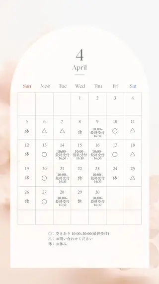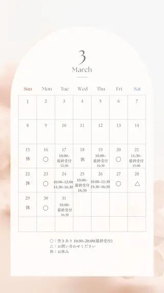 ⚠️子供がいる為、予約日付近や当日にこちらの都合でキャンセル、スタッフの変更をさせて頂く事があります。ご迷惑をおかけする事があるという事をご理解のもとご予約お願い致します。同じサロンでモデル料金で予約枠が15時から空いていても、アートやり放題は最終受付14時です。【下記の注意事項を必ず確認の上、ご予約お願い致します。】月11:30-17:00火11:30-17:00水11:30-17:00木11:30-17:00金11:30-17:00