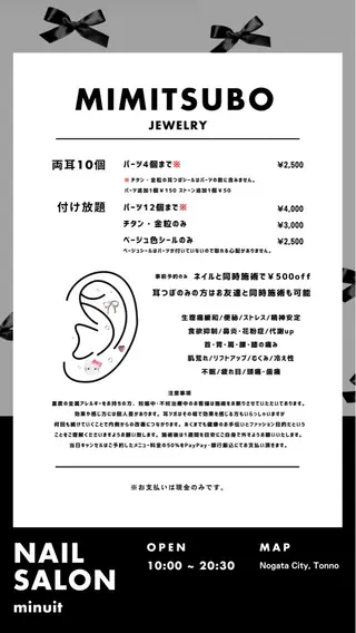 Instagram【nail.salon.minuit】こちらからのご予約だとお安くなってます🌟空き状況もミニモより空いている時間ございます。デザイン画像載せてます。ご質問等はこちらにお願いいたします。ミニモはキャンセルが多い為2週間先までのご予約しか出来ません。当店付替(1ヶ月以上)¥500当店オフのみ¥2,000当店オフのみ(長さ出し/パーツ)¥2,500他店付替¥1,000他店付替(長さ出し5本以内/パーツ)¥1,500他店付替(長さ出し10本以内/爪2cm以上)¥2,000他店付替(スカルプ)ピールオフジ...