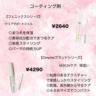 ♥️の登録でメッセージのやり取りができるようになるので登録をお願いいたします!まつ毛パーマ&パリジェンヌ▷ロッド式。まつ毛に優しいトリートメント配合の薬剤を使用しています。浸透も良く短時間でできるのが特徴。まつ毛エクステ▷長さ7~15㎜/J.C.D.L.LC.LDカール/太さ0.15㎜/3色のブラウンカラーエクステあり。(L.LC.LDは7~13㎜ブラックのみ)眉毛ワックス脱毛&HBL▷ワックスシートではなく、温めたワックスを使用しています。ジェル保湿付き🫧ラッシュアディクト(まつ毛美容液)、フェニックス(美容液コ...