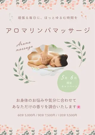 多くの方に当店を知っていただく為に、ミニモ限定料金でご案内いたします。現在2名のスタッフで、お客様のニーズにお応え出来る様に施術の提供できればと思ってます。アットホームな雰囲気の個室でリラックス出来る様に心がけてます。当日予約も大歓迎です。当店はオイルマッサージとヘッドマッサージがオススメです。特にヘッドマッサージはハーブボールを使って行うマッサージやハンドでのヘッドセラピー。そして小顔、頭蓋調整マッサージ等用意しております。ヘッドマッサージは定期的にする事での睡眠や目の疲れ、頭が重い等を和らげてくれます。自分に...