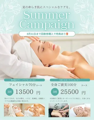 当サロンは20〜70代までの幅広い年齢のお客様にご利用いただいております。サロンに入ればアロマ香る安らぎの空間。お客様だけのプライベート空間で贅沢なお時間をお過ごしいただけます。丁寧なカウンセリングを心がけ、お客様一人一人に合ったケアを提供いたします。当サロンは使用する全ての素材や品質にこだわっております。全てのメニューに使用するエッセンシャルオイルは最高品質として世界でも認められているオイルを。よもぎ、モリンガ、ヘナは農薬・化学肥料不使用のリーフを。また、椅子は背もたれがついており長時間座っていても疲れない設計...