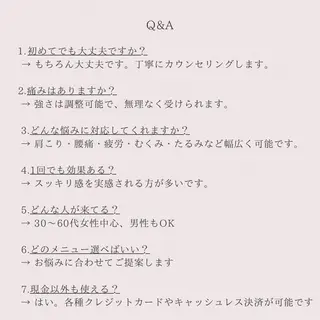 完全個室のプライベートサロン🌿周りを気にせず、ゆったりとした時間をお過ごしいただけます。当店では【揉みほぐし】【オイルトリートメント】【ヘッドスパ】【よもぎ蒸し】など、体の状態に合わせたケアをご提供しています。揉みほぐしは、痛みの少ない優しい圧で筋肉をゆるめ、肩こり・首こり・腰の疲れなどをケア。揉み返しが少ない施術を心がけています。オイルトリートメントでは、リンパの流れを整え、むくみや老廃物の排出を促しながらリラックス効果も期待できます。日頃の疲れやストレスを感じている方にもおすすめです。ヘッドスパは、頭や目の疲...