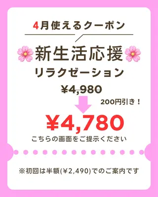 <“話を聞いてもらいたくなる”プライベートサロン>当サロンは仕事や買い物、家事や育児で気づけば1日が終わってしまう。「自分の時間がなかなか取れなくて…」そんな方に多くご利用いただいています。施術後には「肩まわりが軽い」「頭がスッキリした」と、ほっとした表情で帰られる方も。理学療法士の資格を保有しているため「安心して受けられる」というお声もいただいています。安心できる空間で、少しだけ自分のための時間を過ごしてみませんか?----------【リラクゼーション60分コース】初回の方は【¥2,490】でご案内しておりま...