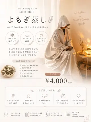 こんなサロンあったらいいな💕をテーマに初回だけのサービス価格はございません毎回サービス価格の安心プライス口コミだけで沢山のお客様にご来店いただき 🌺9周年を迎える事ができました🌺定休日→不定休営業時間→9時〜18時迄(ご予約時間のみ営業)駐車場→無し近隣にコインパーキング多数有スタッフ1名(ベット1台)よもぎ蒸し2台完備(よもぎ蒸し2名様同時可チケットコースの勧誘一切無し‼️PayPay加盟店草加駅東口徒歩5分❣️お願い❣️ミニモ仕様によりお客様の方で当店のお気に入り❤️登録をされていない場合ご予約に関してメッセージのやり取りが出来ないシステムとなっておりますお気に入り❤️登録を必ずお願いします🙏🌿大人気のよもぎ蒸し🌿60分入り放題2000円‼️よもぎ蒸し50分でエアロビ3時間と同等の600キロカロ...