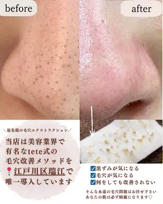 ○ファンデで隠そうとしても隠れない毛穴にお悩みの方○「マスクやファンデで隠す肌」から卒業したい方○毛穴悩みと向き合い自己流でも色々試して頑張ってきた方○本気で毛穴・肌質改善したい方etc↓🌿【取る×鎮める×育てる】肌質を根本改善🌿黒ずみ|たるみ毛穴|開き毛穴|ニキビ跡|凹凸|🌿完全予約制|土日祝営業|夜🌙可能………………………………………………………………………………『エクストラクション』って何??フランス生まれの毛穴ケア『毛穴の汚れを押し出すこと』をさします日本では聞きなれない言葉ですが・・・フランスのエステサ...