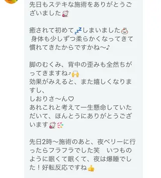 はじめまして当サロンは、仕事や日常生活で蓄積した身体の不調を根本から整えるカイロプラクティックサロンです。長時間のデスクワークや立ち仕事、運動不足・ストレスなどにより、肩こり・腰痛・首の違和感・疲労感を抱えている20〜40代の男性、女性を問わず多くの方が来店されています。当サロンでは施術前にはしっかりとカウンセリングと検査を行い、お身体の状態に合わせて施術方法を選択します。ソフトな調整から必要に応じてボキボキする施術も行い、身体の状態に合わせた安全で効果的なアプローチです。一時的に楽になるのではなく、「動きやすさ...