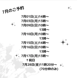 ☆ご予約トラブルを防ぐため他の予約システムと連携しています。メッセージは施術中や営業時間外は基本的にお返事できませんので、お急ぎのお客様はお電話くださいませ。☆当日予約OK☆滋賀県草津市に移転しました。完全予約制、プライベートサロンです。マンツーマンでの接客になりますので、他のお客様と顔を合わせる事なく過ごせます。2DKのハイツの一室を改装したサロン。まつげエクステも周りの目を気にすることなく、ゆっくりとくつろいで頂けます。ご予約お待ちしております。15分以上遅れられる場合は、次のお客様もおられる場合、やむを得ず...