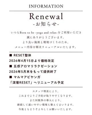 >>>Borntobe-yogaandrelax-あなたは「幸せになるため」に産まれてきた。ありのままを愛し、自分自身を大事にできる場所。リラクゼーションとヨガで心も身体も整えるコンディショニングスタジオ。人の身体はひとつとして同じものはないように身体の状態もひとそれぞれ。あなたのお悩みに合わせて、パーソナルに対応します。快適な状態が長く続くためのコンディショニングを。○*・○*・○*・○*・○注意事項・全てのご利用のお客様へトラブル防止の観点から個人情報の記入をお願いしております。ご記入いただけない場合は、施術...