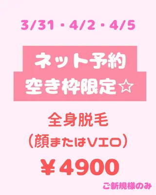 明日3月31日(火)空きあり◎直前割実施中✨【初回 全身脱毛¥5,000❣️】Google【口コミ評価🌟4.9】博多駅筑紫口徒歩1分