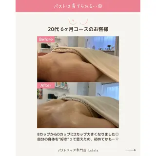 ※当サロンは女性専用サロンとなっております✨️💎Instagram💎バスト🫧→@lelala_bustフェイシャル🫧→@lelala_face"ずっと悩んでいるバスト"...そろそろ本気で向き合ってみませんか?✅長い間バストがコンプレックス✅自分に自信を持てずにいる✅何を試してもダメだった...✅豊胸手術には踏み出せない✅ダイエットでサイズダウンしてしまった✅産後バストが残念なことになってしまったそう感じながらも、"どうせ変わらない"と諦めていませんか?でも実際には、"正しいケア"と"正しい順番"で、バストは年齢を...