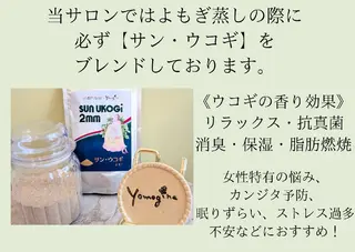 【よもぎ蒸し🌿】安心安全の完全無農薬にこだわってます。お悩みに沿って色々なハーブをブレンドすることもできます。当サロンのよもぎ蒸しには必ずウコギを一緒にお入れしております。カンジタ予防やPMS、ストレスの緩和に良いとされております。【骨盤底筋トレーニングチェア🌈】自分では鍛えることが難しい骨盤底筋が、服着たまま30分椅子に座るだけで3万回のトレーニング効果!体の不調やだるさ、姿勢などその悩み骨盤底筋のゆがみが原因かも……。【フェイシャル💎】毛穴に特化した業界最新機器で毛穴洗浄だけでなく、リフトアップもできてフェイ...