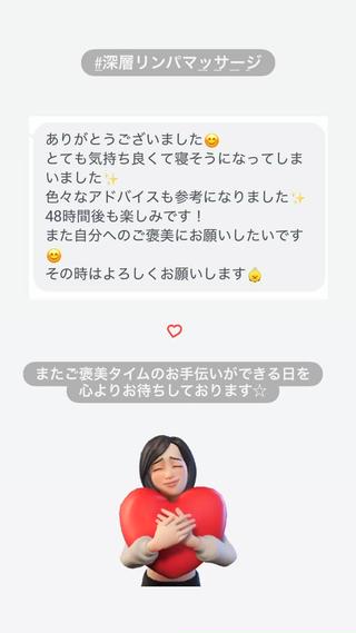 今回で3回目でしたが徐々に浮腫が取れスッキリしてきました!周りにも「痩せた?」と気づいてもらえることが増えてうれしいです!! スタッフの方も優しく分かりやすく説明してくれるので家でのケアも頑張ってます☆ 今回もありがとうございました!またお願いします☆