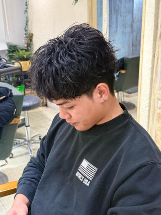 - ツイストスパイラルパーマ、ケアブリーチ、似合わせカラー、マッシュヘア、センターパート、ウルフカット、ハイライト、パーマ、メンズヘア
