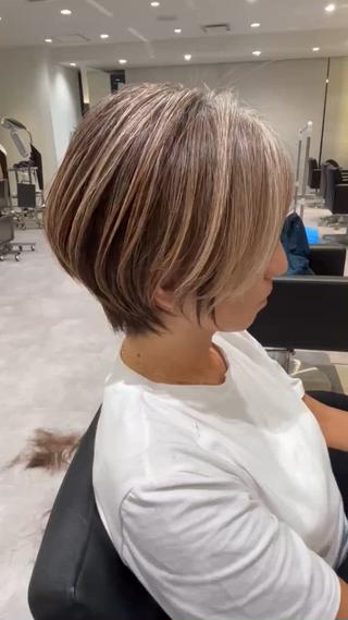 - 透明感カラー、似合わせカラー、前下がりボブ、丸みショート、ハイライト