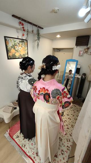 前回2年前に成人式でお世話になり、今回は卒業式でお世話になりました! イメージが完全に固まっていなかったのですが、似合うように髪型も髪飾りも素敵に仕上げて頂きました!持ち込んだ着物の皺を伸ばしていただき、着付けも丁寧にしていただきありがとうございました。施術中も楽しくお喋りさせていただいて、声掛けや配慮など細やかな気遣いや、仕上がり後も写真を撮っていただきありがとうございました。 卒業式ではたくさんの方にたくさんの方に褒めて頂き楽しい卒業式となりました。本当にありがとうございました!また機会があればお願いしたいです!