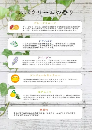 4種類のスパをしております🌈1️⃣クイックスパ(5分)→お時間のないときにほんのひとときのリフレッシュ✨2️⃣モルビドスチームスパ(10分)→毛穴に溜まった汚れを落とし、美しい頭皮へ✨3️⃣ほぐスパ(15分)→クイックスパと肩のマッサージをMIXしたスパです✨4️⃣バリ式クリームスパ(30分)→バリ島発祥のスパで、特別のクリームを使用し香りとスパでリラックスして頂けます✨※スパのみでのご来店の際はドライ料金またはブロー料金が発生致します。ご了承下さい🙇ドライ料金:1100円ブロー料金:2200円